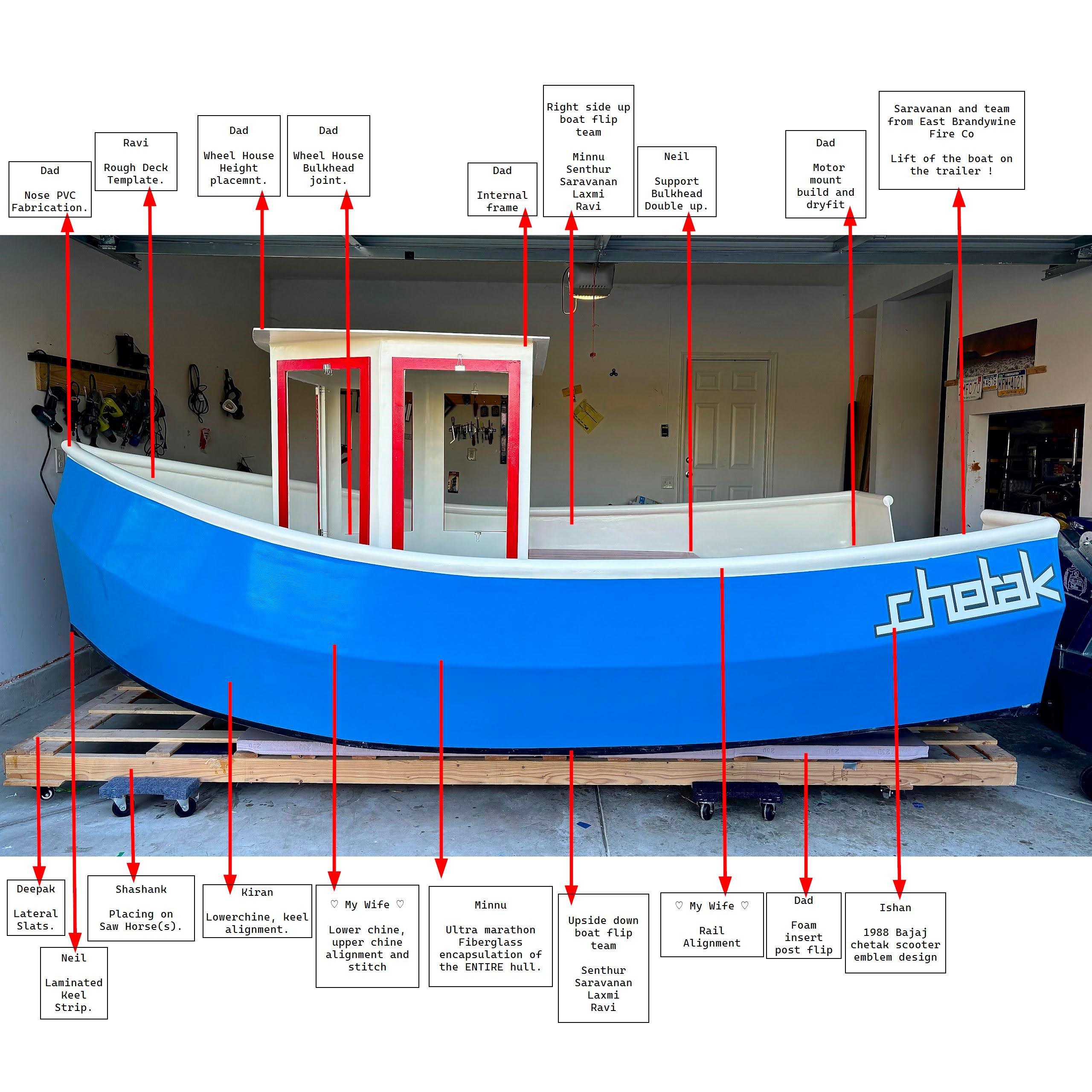 Following are the people, that helped me with the build, process. Fiberglass encapsulation and flipping the boat right side up during construction could not be done by just myself. Required a team of team of friends to help me with this.