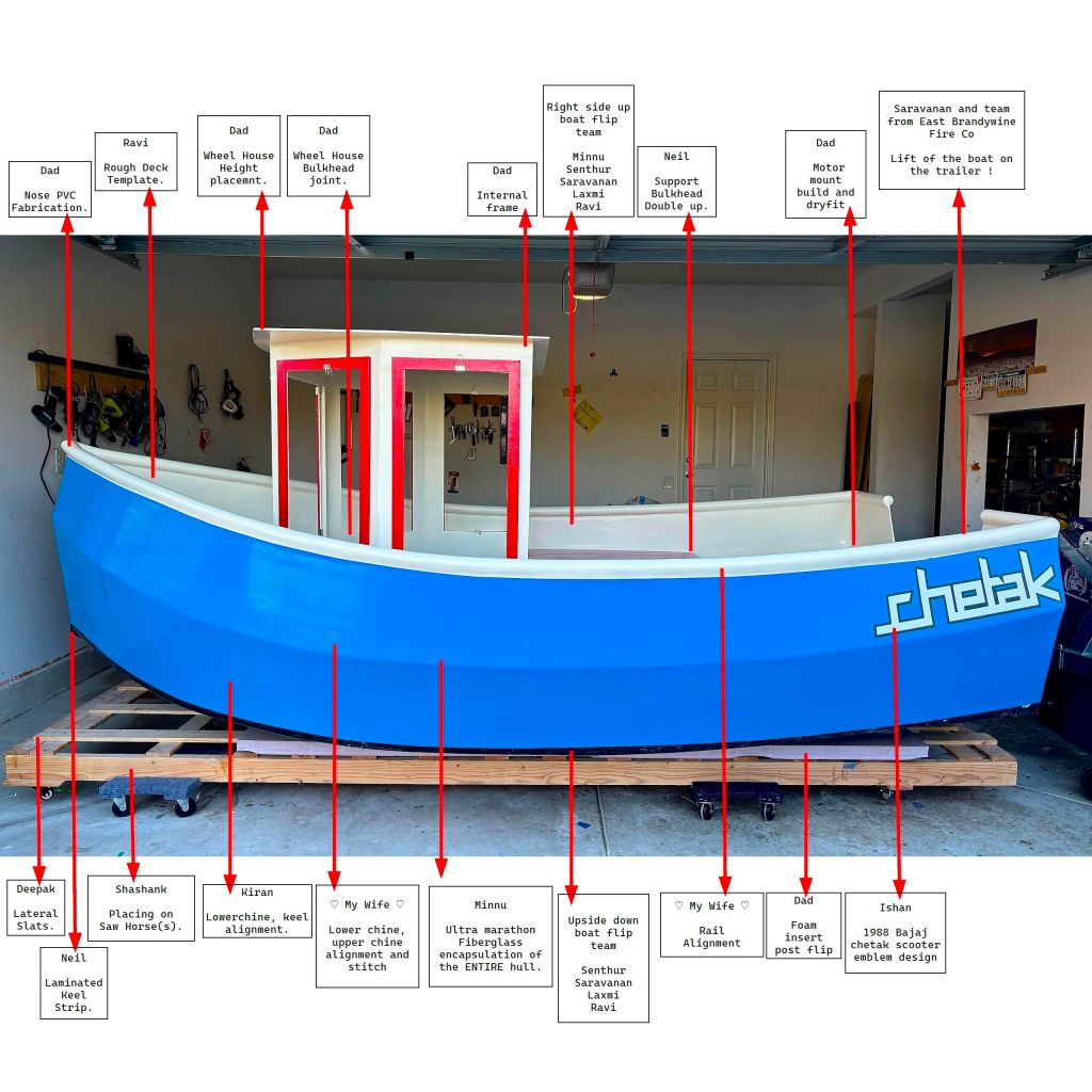 Following are the people, that helped me with the build, process. Fiberglass encapsulation and flipping the boat right side up during construction could not be done by just myself. Required a team of team of friends to help me with this.